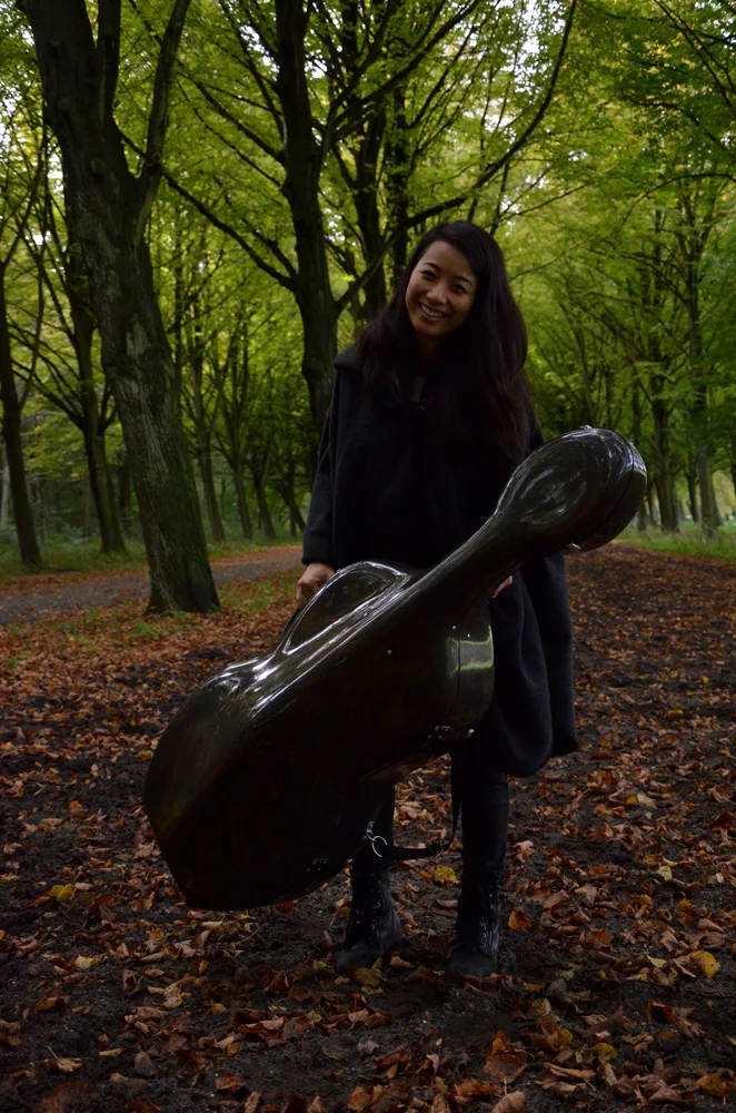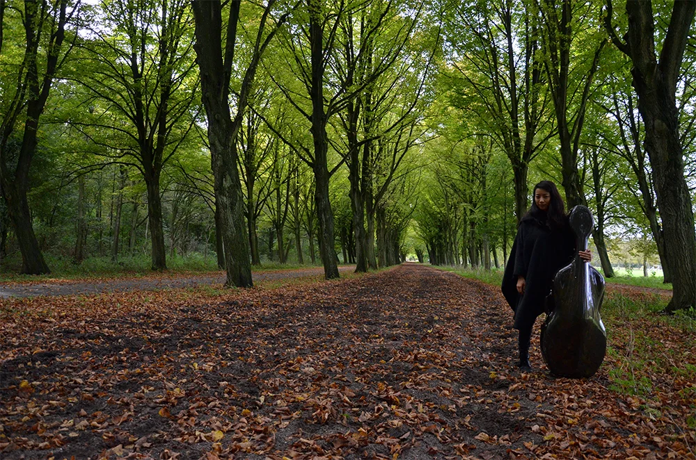 The day we filmed was a rather chilly Autumn day but really beautiful. We set out kind of early with a morning coffee, and had to find a bike shop to pump up our bike tyres on the way. I had my cello on my back and all our equipment in a backpack. We headed to the Amsterdamse Bos (basically the only forest of Amsterdam) and we walked for at least one hour scouting the location for a good spot to shoot. There were a lot of horse riders and groups of runners who we needed to avoid for the shoot. We were looking for a place that was rather quiet because I was going to record the audio live and also I needed to find a log as a seat because we didn't bring one. Eventually we found a really beautiful spot where I could sit down and the only noises were of planes and the birds.